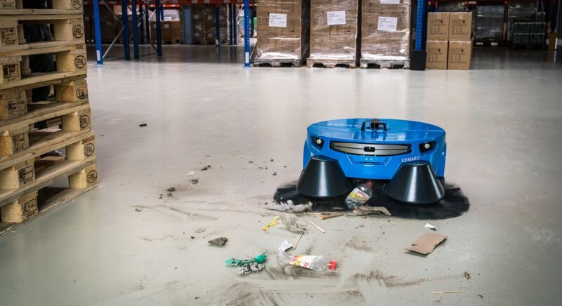 Der Reinigungsroboter K900 von KEMARO (Kehrmaschinen-Roboter) dreht in Lagerhallen seine Runden. Er saugt gröberen Schmutz, PET- und Glasflaschen sowie Holzklötze von Paletten auf. Dank Sensoren und Software behält er auch bei veränderter Umgebung die Orientierung. Mit 35 cm Bauhöhe bleibt er niedrig und passt unter Regale. «Wir haben den Roboter von A bis Z selbst entwickelt», sagt Ingenieur und KEMARO-Mitgründer Martin Gadient.